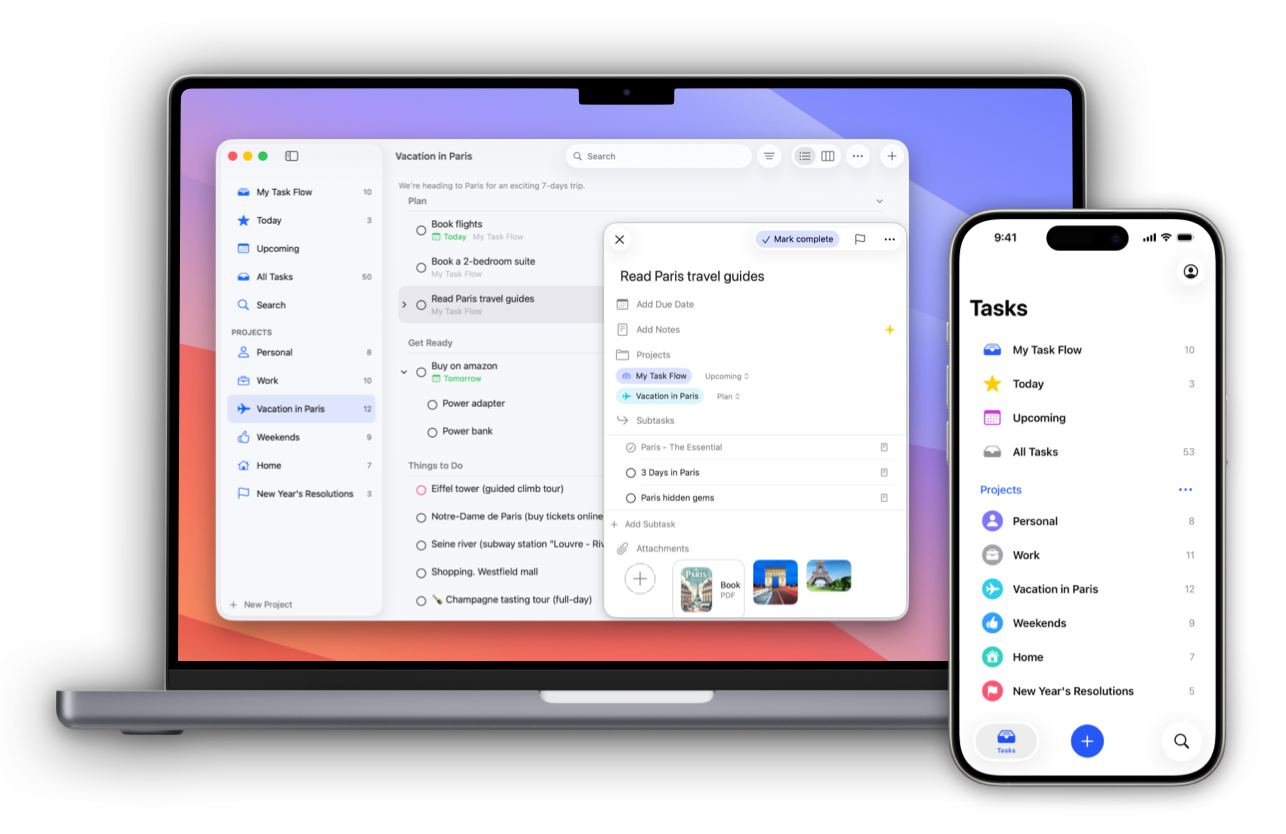 I’ve been using Task Flow since it was launched. I’ve switched from the Todoist. It has some features that I have been looking for for a long time, like adding a project to multiple tasks, unlimited levels of subtasks, attachments, etc…